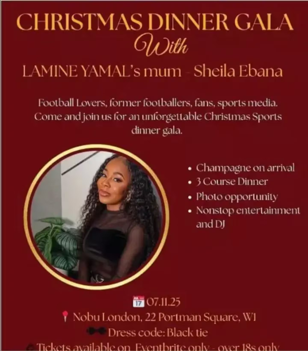 Sheila Ebana, madre del crack de Barcelona, organiza una cena exclusiva en un hotel de Londres con entradas desde 150 hasta 800 euros y cupo limitado a 400 personas.