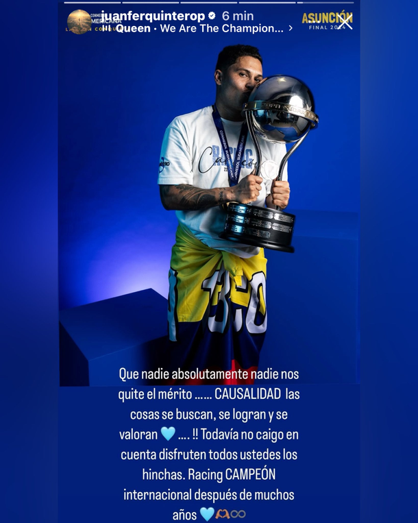 Luego añadió: "Todavía no caigo en cuenta. Disfruten todos ustedes, los hinchas. Racing CAMPEÓN internacional después de muchos años".