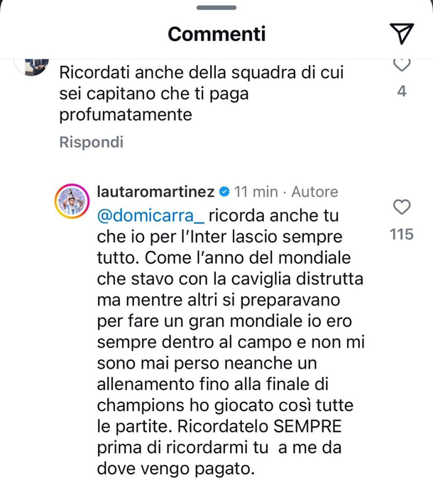 “Recuerda también el equipo que capitaneas y que te paga generosamente”, le escribió un simpatizante del Nerazzurri. La respuesta fue inmediata y firme: “Recuerda también que siempre lo dejo todo para el Inter", comenzó respondiendo el atacante.