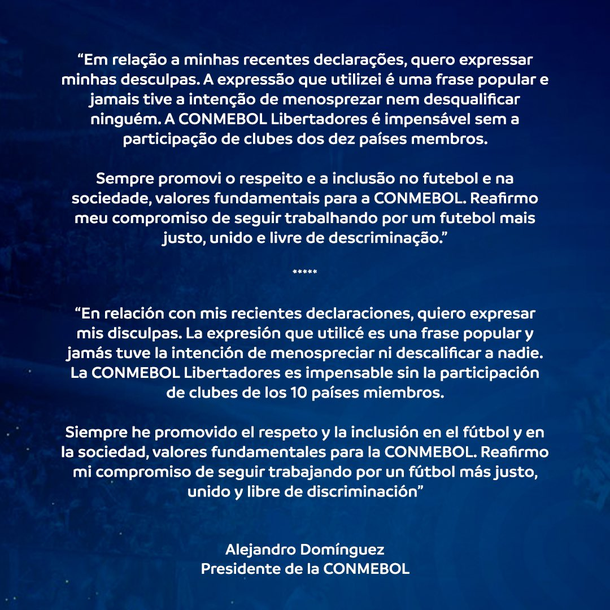 El pedido de disculpas de Alejandro Domínguez en un comunicado