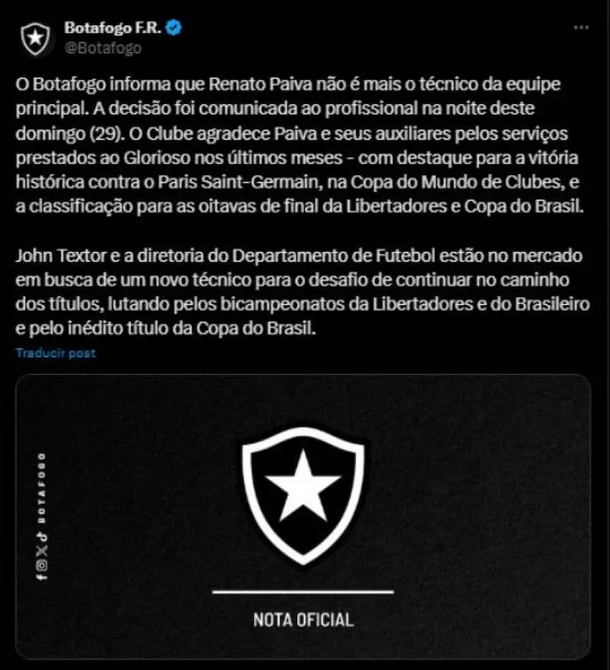 A través de un comunicado en sus redes sociales, el club confirmó la noticia: “Botafogo informa que Renato Paiva deja el cargo de entrenador del equipo principal. La decisión fue comunicada al profesional la noche del domingo. El club agradece a Paiva y a sus asistentes los servicios prestados al Glorioso en los últimos meses”.