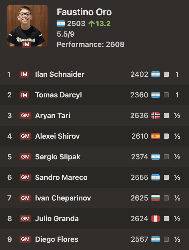Actualmente, Faustino Oro posee un Elo de 2503, cifra que lo coloca en una posición privilegiada para alcanzar el objetivo. El hecho de que Kaspárov, quien también había sido campeón del mundo siendo muy joven en 1985, siga con atención su recorrido no hace más que reforzar la dimensión de lo que está logrando el ajedrecista argentino.