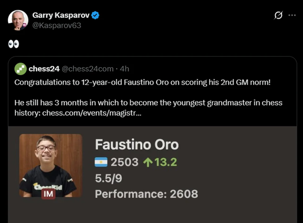 El excampeón del mundo y leyenda del ajedrez reaccionó en la red social X a una publicación que destacaba el nuevo logro de Oro. Con un simple emoji de ojos atentos, Kaspárov dejó en claro que sigue de cerca la evolución del argentino, quien acaba de superar los 2600 puntos de rendimiento por segunda vez en su corta pero impactante carrera. El mensaje, breve pero contundente, fue interpretado como una señal de reconocimiento por parte de una autoridad absoluta del juego ciencia.