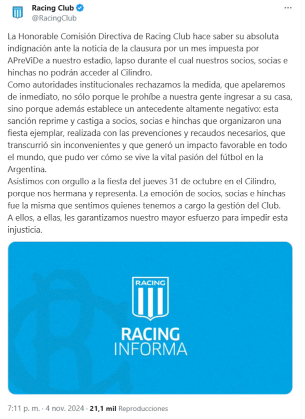 El club difundió un comunicado en el que informó que “la Honorable Comisión Directiva de Racing Club hace saber su absoluta indignación ante la noticia de la clausura por un mes impuesta por Aprevide a nuestro estadio, lapso durante el cual nuestros socios, socias e hinchas no podrán acceder al Cilindro”.