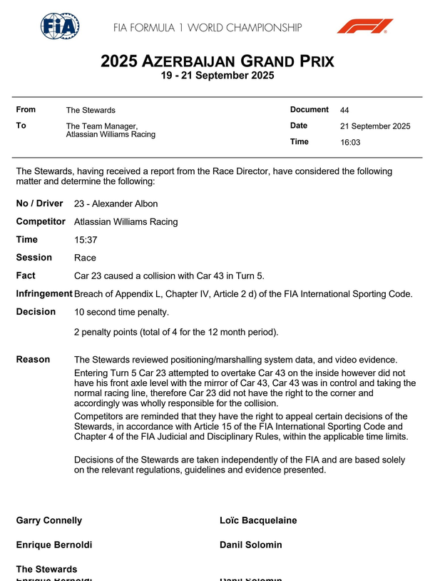 Los comisarios consideraron que el piloto de Williams fue “totalmente responsable” y le aplicaron diez segundos de recargo junto con dos puntos en la superlicencia. El problema es que el castigo resultó simbólico frente al perjuicio real.