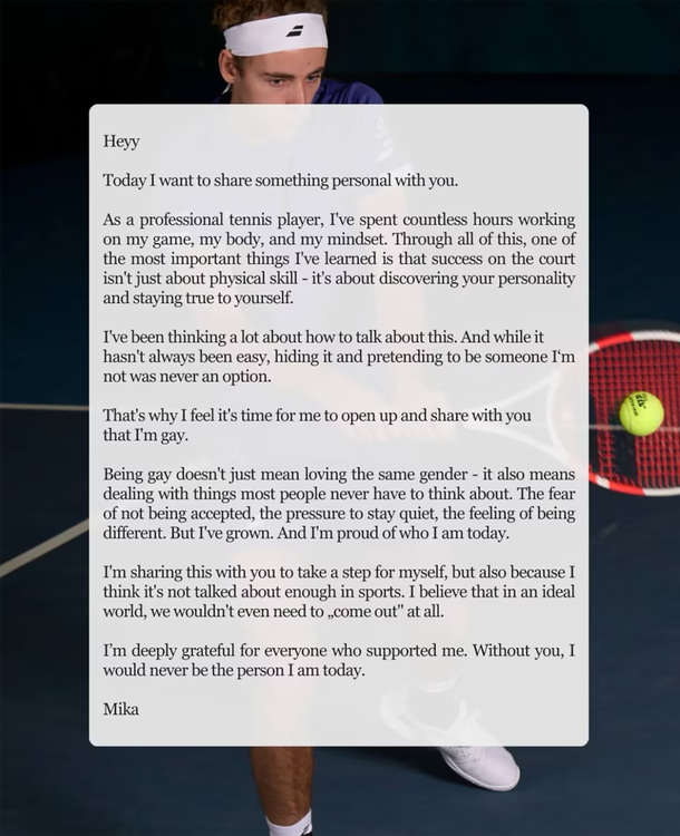 Allí escribió: “Como jugador profesional de tenis, he pasado incontables horas trabajando en mi juego, mi cuerpo y mi mentalidad. A través de todo esto, una de las cosas más importantes que aprendí es que el éxito en la cancha no se trata solo de habilidad física: también se trata de descubrir tu personalidad y mantenerte fiel a quien sos. He estado pensando mucho en cómo hablar de esto. Y aunque no siempre fue fácil, ocultarlo y fingir ser alguien que no soy nunca fue una opción. Por eso siento que es momento de abrirme y compartir con ustedes que soy gay".