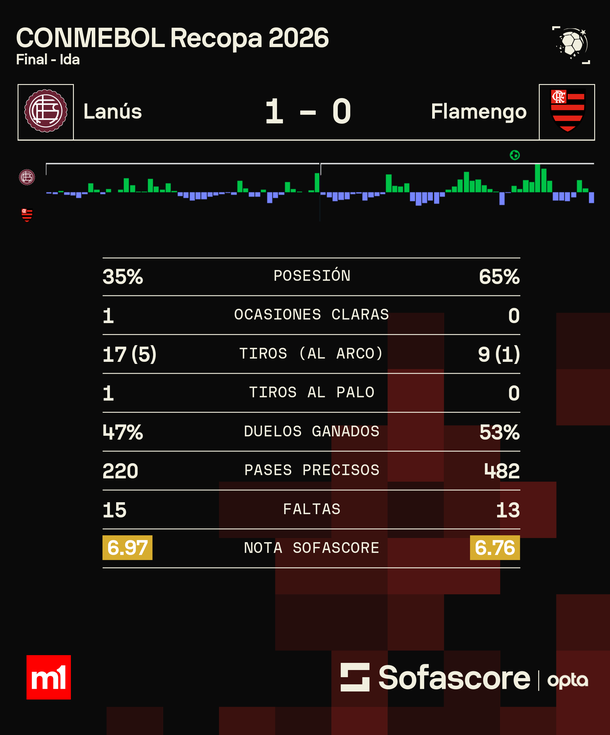En el marco del encuentro de ida en la Argentina, Lanús venció 1-0 a Flamengo este jueves, para abrir con un triunfo la serie por la Recopa Sudamericana 2026 que enfrenta a los dos campeones de Conmebol del 2025.