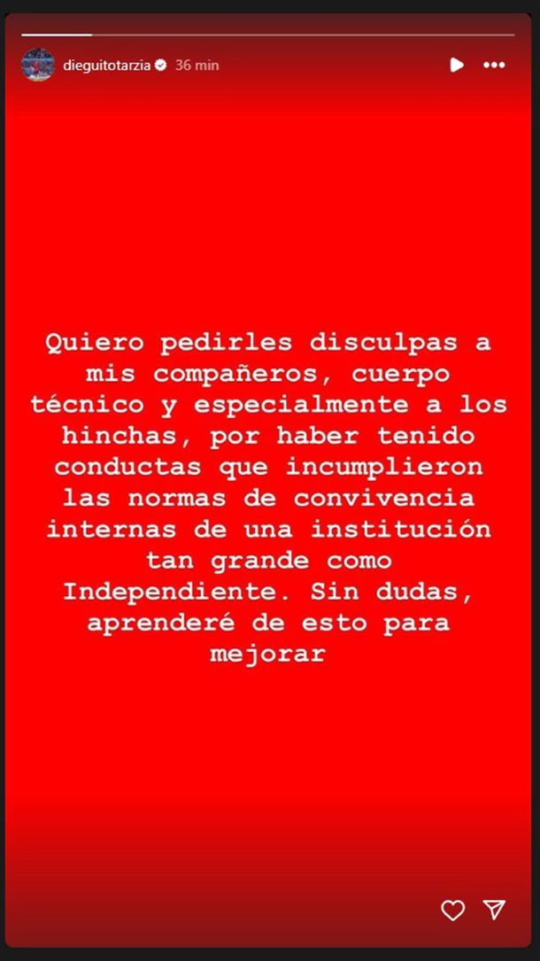 Casi al mismo tiempo, el atacante surgido de las inferiores del Rojo también pidió perdón: “Quiero pedirles disculpas a mis compañeros, cuerpo técnico y especialmente a los hinchas, por haber tenido conductas que incumplieron las normas de convivencia internas de una institución tan grande como Independiente. Sin dudas, aprenderé de esto para mejorar”, escribió Tarzia, de 21 años.