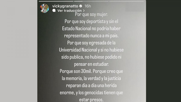 "Porque soy mujer. Porque soy deportista y sin el Estado Nacional no podría haber representado nunca a mi país. Porque soy egresada de la Universidad Nacional y si no hubiese sido pública, no hubiese podido ni pensar en estudiar", escribió ayer Granatto en una historia de su cuenta personal de la red social Instagram.