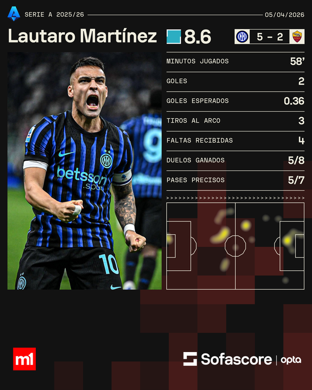 Los números de Lautaro Martínez en el triunfo de Inter ante Roma