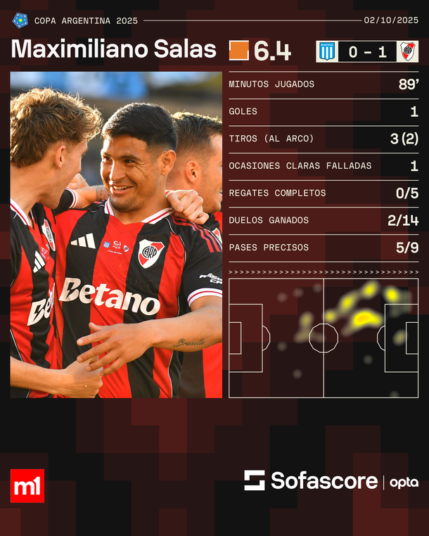 River pegó primero en el duelo ante Racing por los cuartos de final de la Copa Argentina y lo hizo de la mano de un protagonista especial: Maximiliano Salas. El delantero, con pasado en la Academia, fue el encargado de romper el cero en el estadio Gigante de Arroyito y poner en ventaja al equipo de Marcelo Gallardo.
