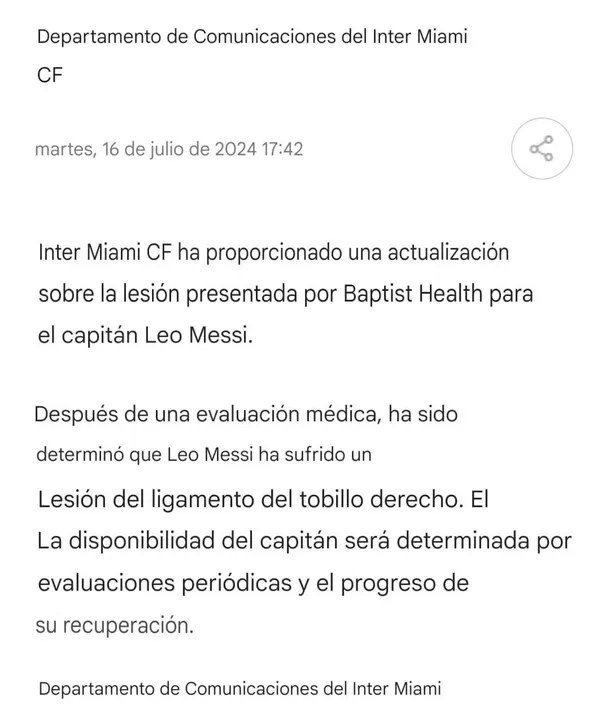 En este sentido, Inter Miami -club del astro mundial- emitió un comunicado luego de los estudios que le realizaron y confirmaron que la Pulga sufrió una lesión ligamentaria en el tobillo derecho.