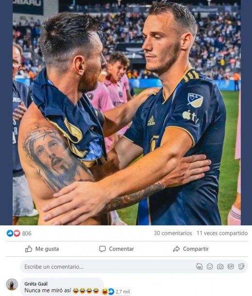 Gazdag compartió en su Instagram la foto abrazándose con Messi. Entre los comentarios que recibió estaba el de su esposa Gréta Gaál, que más que un comentario le dejó un cómico reclamo: “Nunca me miró así”.