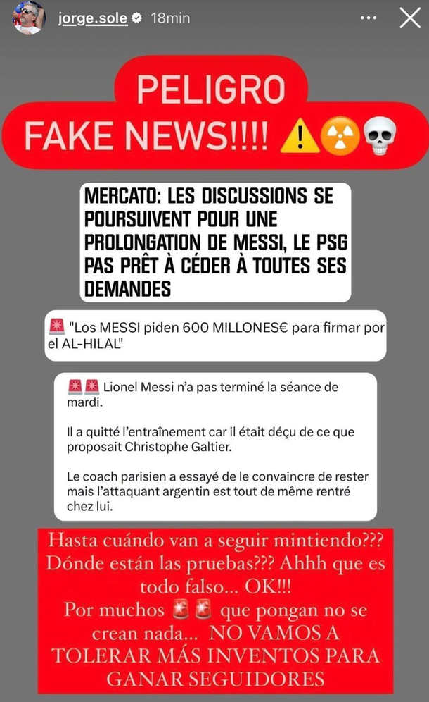 “¡Peligro, fake news! ¿Hasta cuándo van a seguir mintiendo? ¿Dónde están las pruebas? Ah, que es todo falso...OK. Por muchos (emoji de alarma) que pongan no se crean nada. No vamos a tolerar más inventos para ganar seguidores”, escribió Jorge en su cuenta de Instagram.