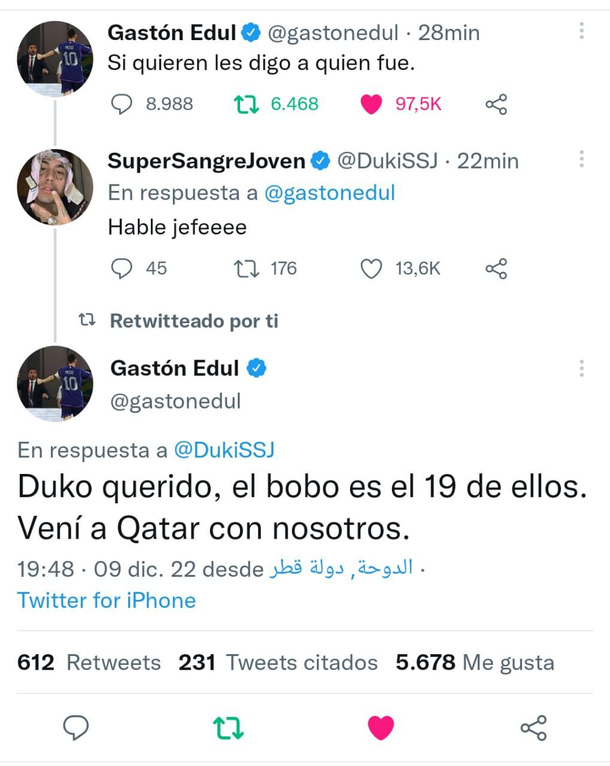 De todos modos, Gastón Edul prometió contar de quién se trataba. "Si quieren les digo quién fue", escribió en Twitter, y luego se lo confirmó a Duki.