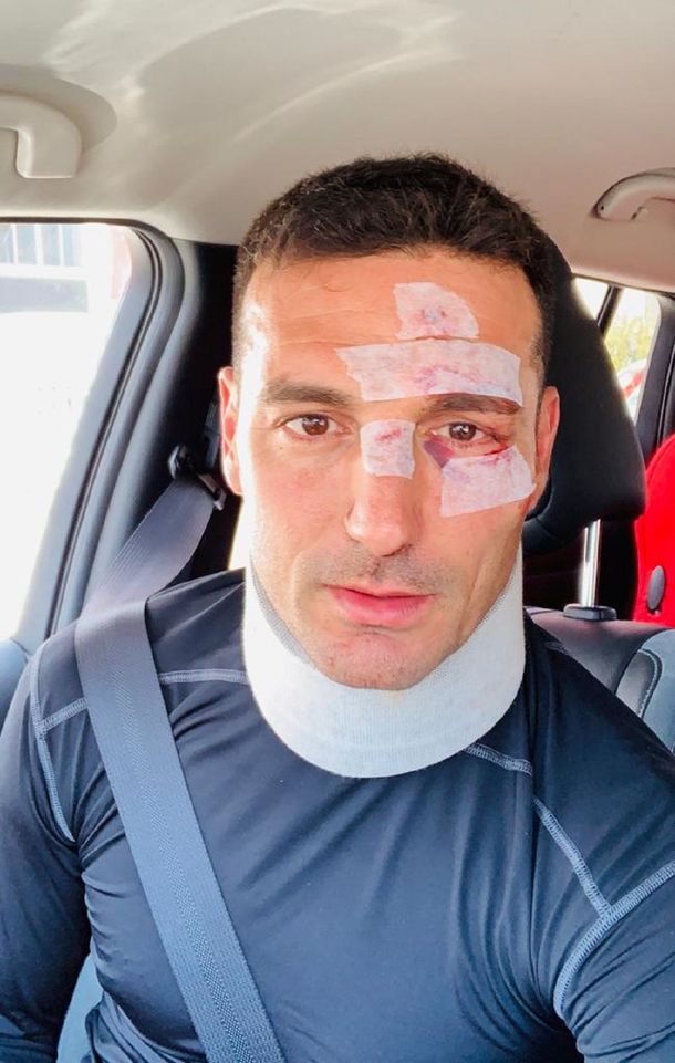 Como producto del choque, Scaloni cayó con su bicicleta y su cara dio de lleno con el pavimento, provocándole heridas cortantes bajo el ojo izquierdo, en la nariz y dos más importantes sobre la frente.
