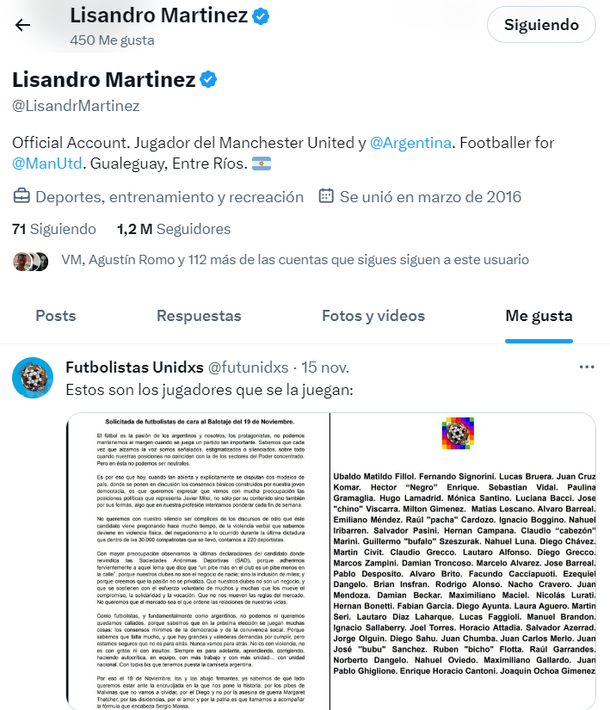 El jugador del Manchester United le dio "me gusta" al comunicado de “Futbolistas Unidxs” de cara al balotaje. En la comunicación se expresa "mucha preocupación las posiciones políticas que representa Javier Milei". Allí también se repudia las sociedades anónimas deportivas y se apoya la candidatura de Sergio Massa.