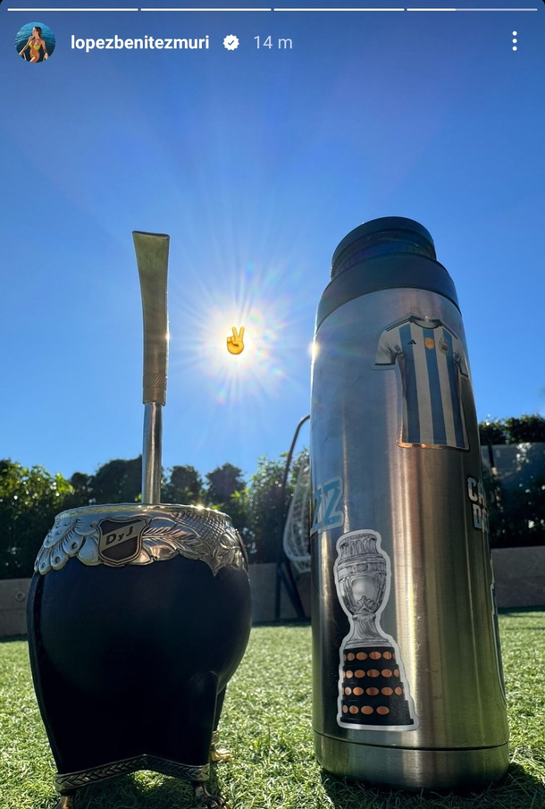 La imagen, capturada desde abajo hacia arriba, con césped y cielo, tiene como protagonistas a un mate de un lado y un termo del otro, mientras que en el centro donde está el sol se puede apreciar el emoji de la "V" de la victoria, un claro símbolo peronista.