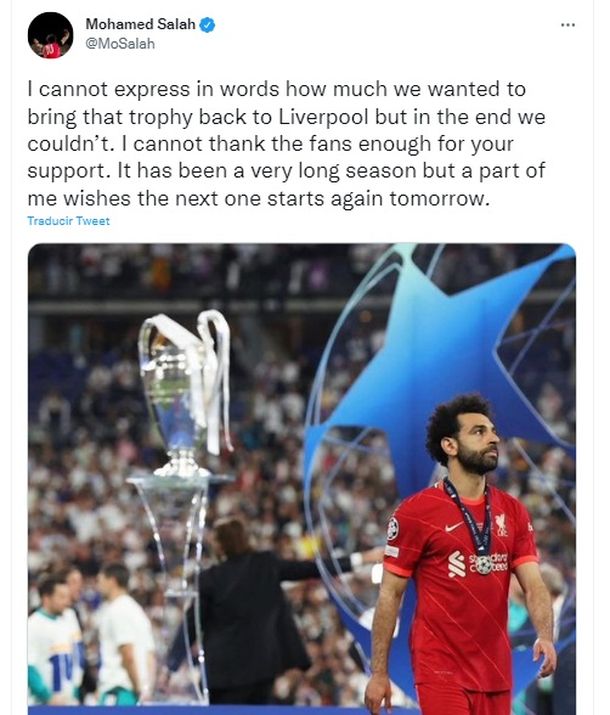 "No puedo expresar con palabras lo mucho que queríamos traer ese trofeo de vuelta a Liverpool, pero al final no pudimos", publicó Salah.
