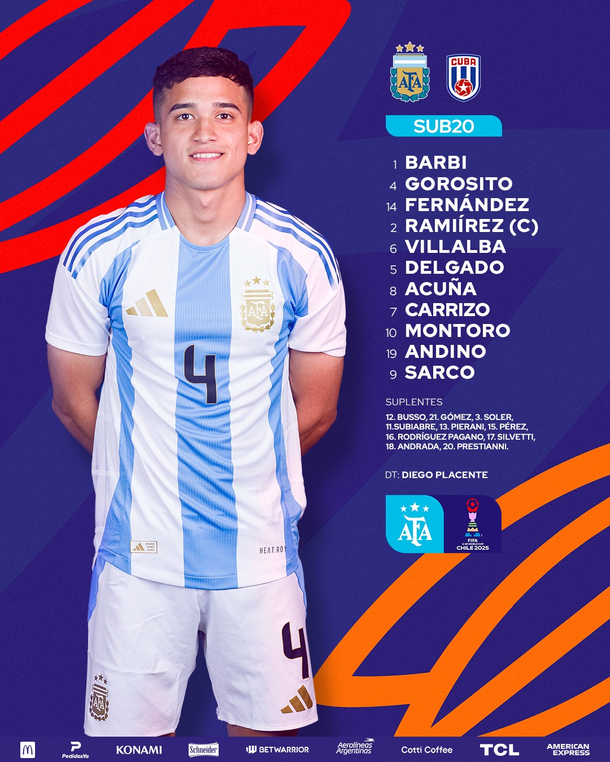 El técnico planteará un esquema 4-2-3-1 para enfrentar a Cuba. El once inicial será: Santino Barbi; Dylan Gorosito, Santiago Fernández, Tobías Ramírez, Juan Villalba; Milton Delgado, Valentino Acuña; Maher Carrizo, Álvaro Montoro, Santino Andino y Alejo Sarco.