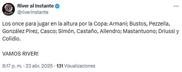 • River: Armani; Bustos, Pezzella, González Pirez, Casco; Simón, Castaño, Aliendro; Mastantuono; Driussi y Colidio. DT: Marcelo Gallardo.