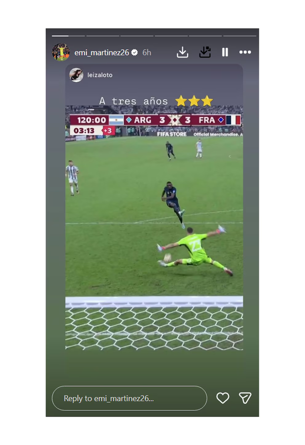 Emiliano “Dibu” Martínez también tuvo un rol activo en el aniversario. El arquero fue compartiendo distintas historias en su cuenta de Instagram, donde se destacaron imágenes de su atajada decisiva ante Randal Kolo Muani, el momento en que recibió el Guante de Oro como mejor arquero del torneo y escenas de los festejos junto a sus compañeros y su familia.