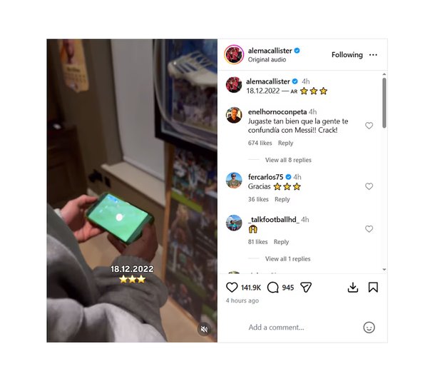 Alexis Mac Allister, Enzo Fernández y Nicolás Otamendi también se sumaron con distintos posteos, desde videos íntimos hasta imágenes del festejo colectivo en Lusail. Otros campeones como Lautaro Martínez, Nicolás Tagliafico y Thiago Almada eligieron compartir fotos del podio, besando la Copa o celebrando con el plantel completo.