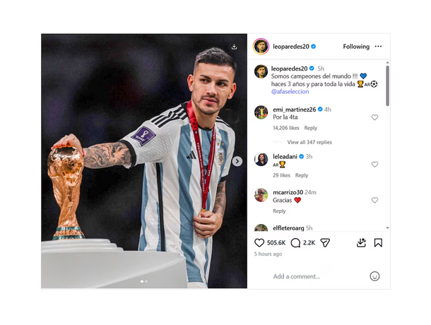 Leandro Paredes, por su parte, eligió una foto tocando el trofeo rumbo al podio y una frase que resume el sentimiento colectivo: “Somos campeones del mundo. Hace tres años y para toda la vida”.