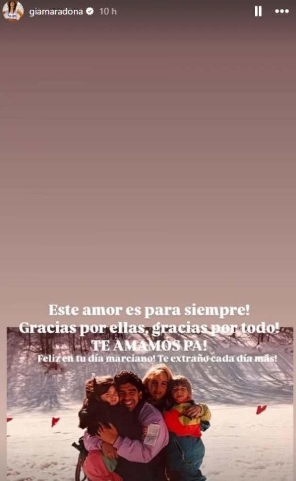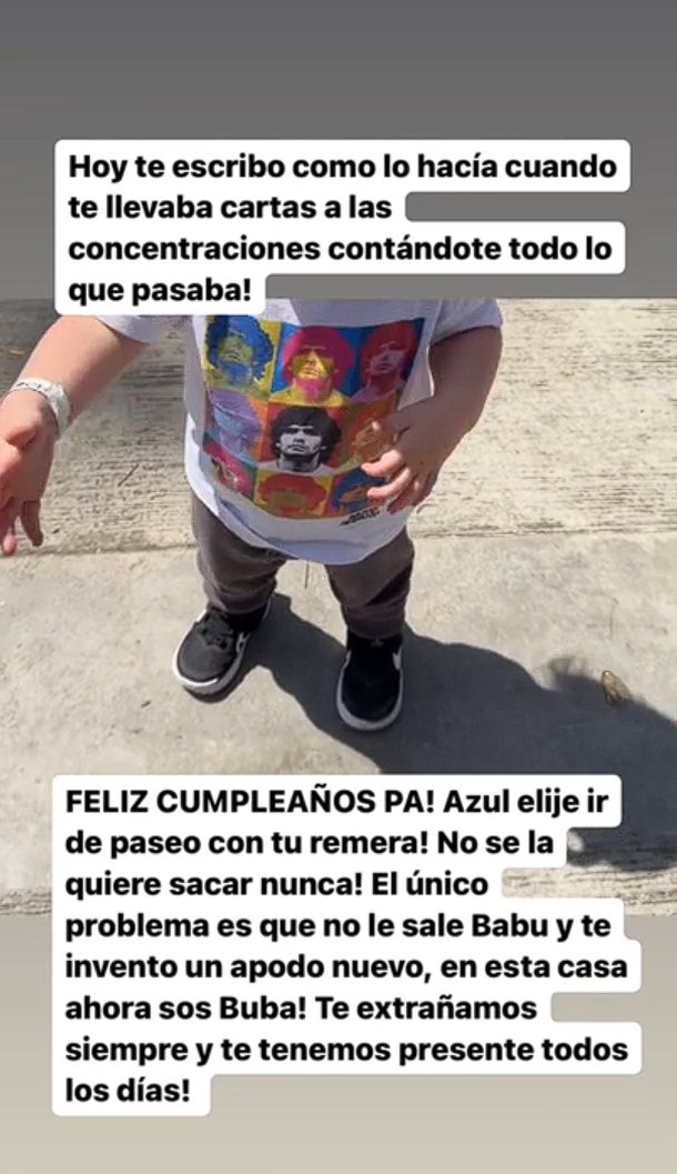 A través de su cuenta, compartió una tierna historia en la que contó cómo su hija Azul, nieta de Diego, escogió llevar puesta una camiseta de su abuelo en un paseo especial: "Hoy te escribo como cuando te llevaba cartas a las concentraciones. Feliz cumpleaños pa, Azul elige tu remera y ahora te inventó un nuevo apodo: Buba".