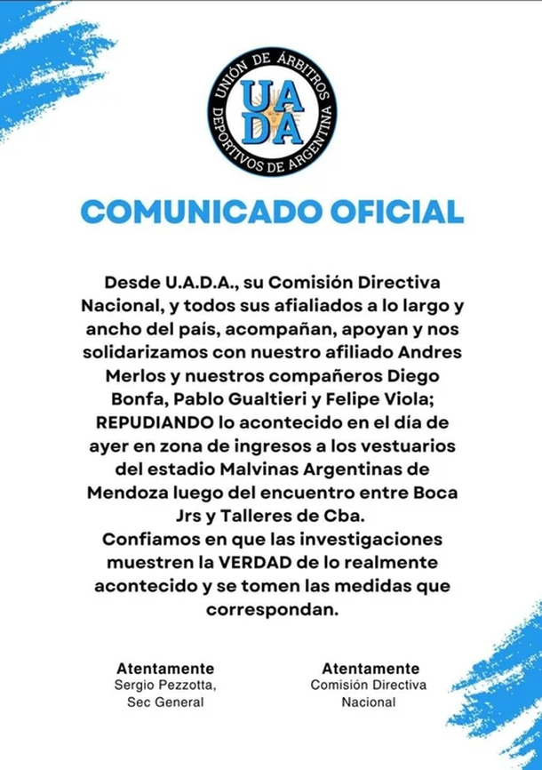 En el caso de la Unión de Árbitros Deportivos de Argentina, su mensaje fue contundente: “Desde UADA, su Comisión Directiva Nacional y todos sus afiliados a lo largo y ancho del país, acompañan, apoyan y nos solidarizamos con nuestro afiliado Andrés Merlos y sus colegas Diego Bonfa, Pablo Gualtieri y Felipe Viola”. Además, añadieron: "Confiamos en que las investigaciones revelen la verdad de lo acontecido y se tomen las medidas correspondientes".