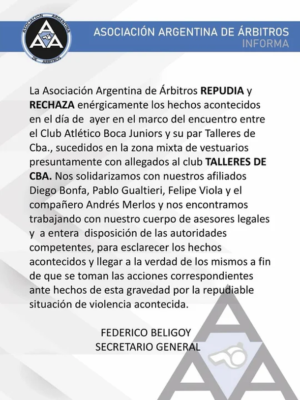 Por su parte, la Asociación Argentina de Árbitros también mostró su rechazo y expresó: "La AAA repudia y rechaza enérgicamente los hechos acontecidos en el marco del encuentro entre Boca Juniors y Talleres de Córdoba, en la zona mixta de vestuarios, presuntamente con allegados al club cordobés".