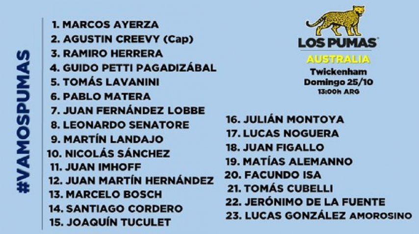 El capitán Creevy se recuperó de sus molestias y estará en el campo de juego ante los Wallabies en la segunda semifinal del Mundial de Rugby. Además, Landajo le ganó la pulseada a Cubelli y el centro vuelve tras la suspensión.