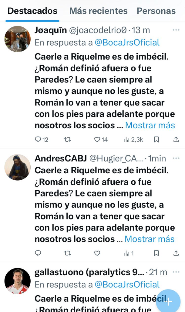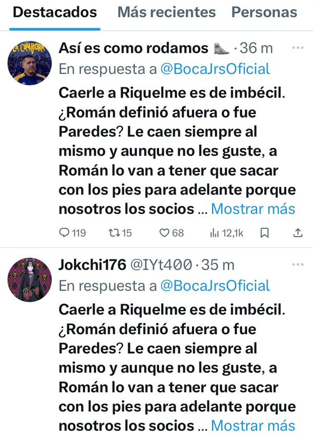 De hecho, la exposición de que el titular del club tendría defensores personales que actúan en masa fue realmente obscena: un gran número de tuiteros publicó el mismo mensaje. "Caerle a Riquelme es de imbécil. ¿Román definió afuera o fue Paredes? Le caen siempre al mismo y aunque no les guste, a Román lo van a tener que sacar con los pies para adelante porque nosotros los socios de verdad, los que amamos al club no vamos a permitir que lo derroquen", rezaba el tuit que se repitió en varias cuentas.