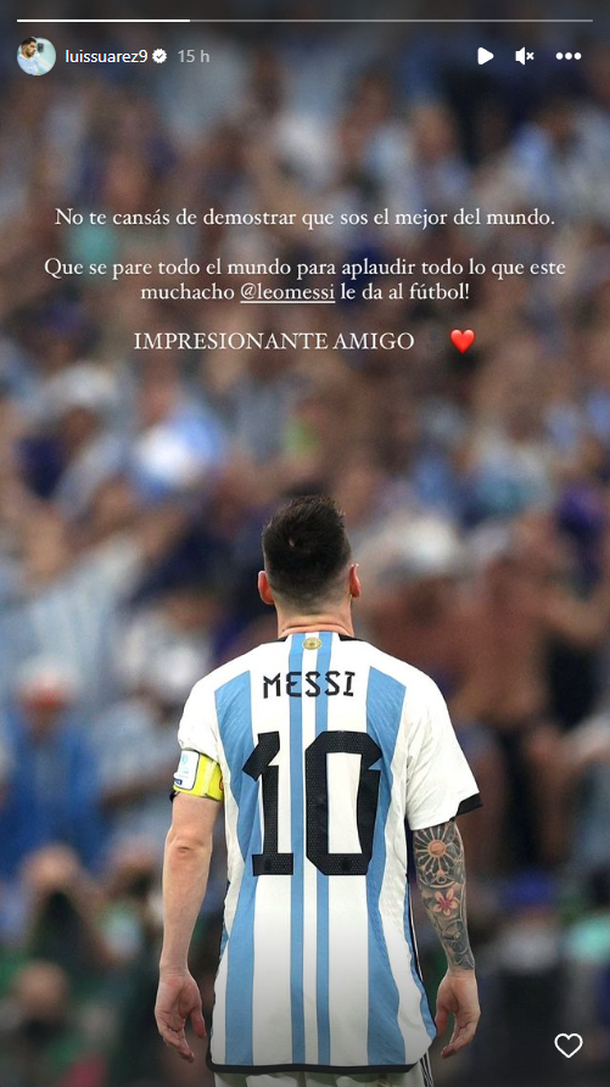 El delantero uruguayo Luis Suárez felicitó y elogió a su amigo Lionel Messi por la victoria de la Argentina ante Croacia por 3 a 0, lo que significó el pase de la Selección a la final del Mundial de Qatar 2022.
