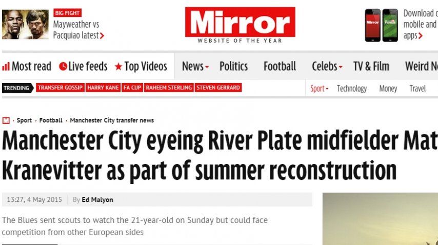 El mediocampista central y gran figura y promesa de River, Matías Kranevitter, está en la mira del Manchester City que dirige el chileno Manuel Pellegrini, según afirman medios de Inglaterra.