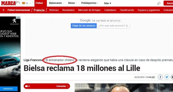 La nota del diario Marca apuntaba a la millonaria suma que reclama el ex DT del Lille al club francés tras su conflictiva salida. En la volante de la misma puede leerse: "El entrenador chileno lo reclama alegando que había una clásula en caso de despido prematuro".