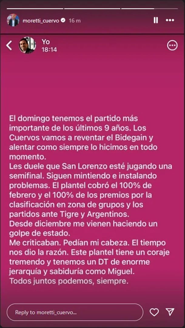 En otra historia publicada en Instagram, Moretti aseguró que los jugadores cobraron el ciento por ciento los sueldos de febrero y los premios por clasificar a los playoffs, además de que sigue alegando que quieren hacerle un “golpe de estado” y que “les duele ver a San Lorenzo donde está”.