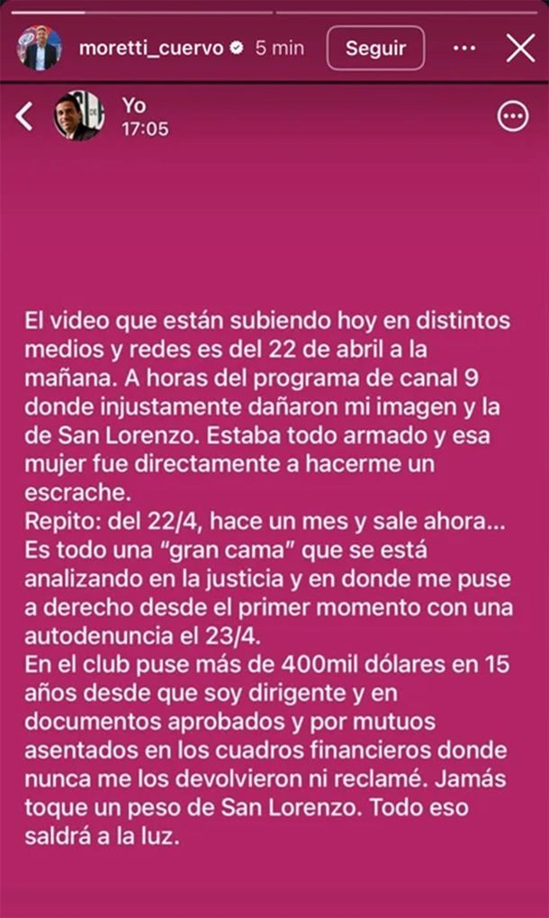 Pero horas después de divulgarse el video, Moretti aseguró que en redes sociales que es falso, y que llevará las acciones a la Justicia para no dejar que manchen su reputación. “El video que están subiendo hoy en distintos medios y redes es del 22 de abril a la mañana. A horas del programa de Canal 9 donde injustamente dañaron mi imagen y la de San Lorenzo”, precisó.