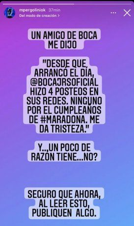 En su cuenta de Instagram, Mario escribió: "Un amigo de Boca me dijo: 'desde que arrancó el día, Boca hizo cuatro posteos en sus redes. Ninguno por el cumpleaños de Maradona. Me da tristeza'".