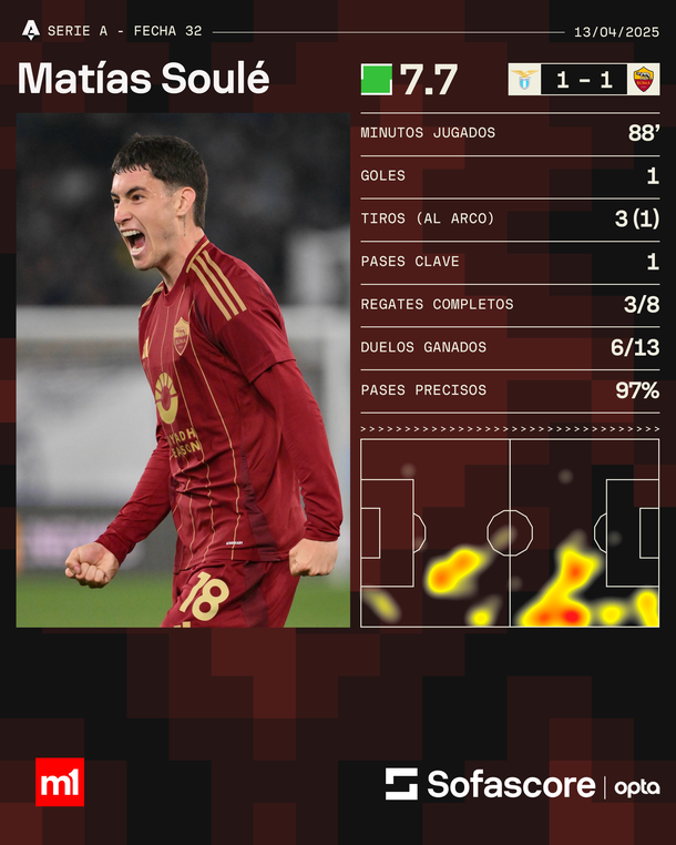 El clásico romano dejó emociones fuertes y un golazo inolvidable de Matías Soulé, que le dio el empate a la Roma ante la Lazio, en un duelo disputado en el estadio Olímpico por la fecha 32 de la Serie A. El joven argentino, cedido por Juventus y que viene teniendo grandes rendimientos desde lo individual, volvió a demostrar por qué es uno de los futbolistas albicelestes con más proyección en Europa.