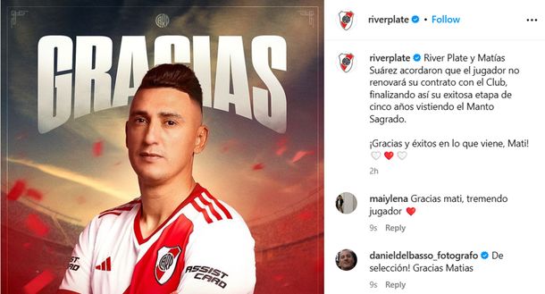 Si bien no trascendieron explícitamente los motivos de su salida, el club lanzó una publicación en sus redes sociales donde saluda y agradece al delantero que arribó a Núñez en enero de 2019: "River Plate y Matías Suárez acordaron que el jugador no renovará su contrato con el Club, finalizando así su exitosa etapa de cinco años vistiendo el Manto Sagrado. ¡Gracias y éxitos en lo que se viene Mati!", rezó el comunicado.