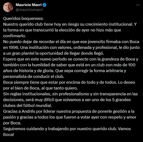 "Queridos boquenses: Nuestro querido club tiene hoy en riesgo su crecimiento institucional. Y la forma en que transcurrió la elección de ayer no hizo más que confirmarlo. No puedo dejar de recordar el día en que ese jovencito firmaba con Boca en 1996. Una institución con valores, ordenada y profesional, le dio junto a un gran plantel la oportunidad de llegar donde llegó. Espero que en este nuevo período se conecte con la grandeza de Boca y también con la humildad de saber que está en un club con más de 100 años de historia y de gloria. Que sepa corregir la forma arbitraria y personalista de conducir el club. Boca siempre tiene que estar por encima de todo y de todos. Lo deseo por el bien de Boca, al que tanto quiero. Sin reglas institucionales, sin profesionalismo y sin transparencia en las decisiones, será muy difícil que volvamos a ser uno de los 5 grandes clubes del fútbol mundial. Gracias a Andrés por liderar nuestra propuesta de ponerle gestión a la pasión y gracias a todos los que fueron a votar ayer con respeto y amor por Boca. Seguiremos cuidando y trabajando por nuestro querido club. Vamos Boca!".