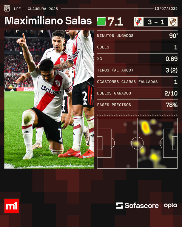 Maxi Salas fue uno de los jugadores destacados de la victoria de River, según el sitio Sofascore que le otorgó un puntaje de 7.1. En 90 minutos de juego, aportó un gol pero también tres tiros al arco y una ocasión fallada.