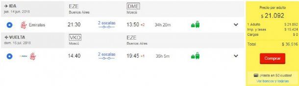Emirates ofrece uno de los pasajes más baratos con dos escalas (34 horas hasta Moscú) por 36.516 pesos. Para aquellos que prefieran hacer un vuelo más corto con una sola escala, Lufthansa ofrece un vuelo por 37.918 pesos (18 horas). Los vuelos en primera clase pueden llegar hasta los 122.000 pesos.