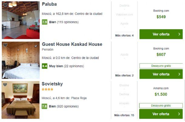 Una habitación doble en los hoteles más baratos de Moscú, de tres estrellas, pueden ir desde los 550 pesos diarios hasta los 1.500. Para aquellos que deseen quedarse hasta el final del torneo, el precio final ronda entre los 16.500 y los 18.600 pesos por todo el mes, es decir, entre $8.250 y $22.500 por persona.