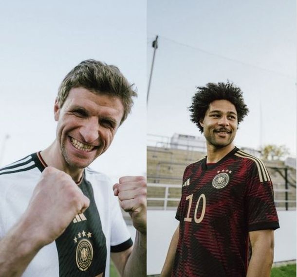 La Selección de Alemania es una de las pocas que se animó con un cambio más osado en su primera equipación, rompiendo con su habitual blanco total al introducir una franja negra gruesa que recorre de arriba abajo el centro de la camiseta. La segunda sigue con el patrón jaspeado que ha introducido Adidas en varias de sus camisetas combinando los colores negro y granate.