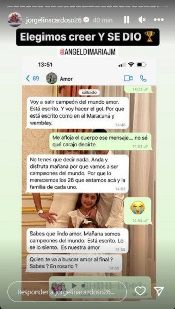 En una conversación de WhatsApp previa a la final del Mundial de Qatar 2022, "Fideo" le confesó a Jorgelina como podía darse el partido ante Frnacia.
