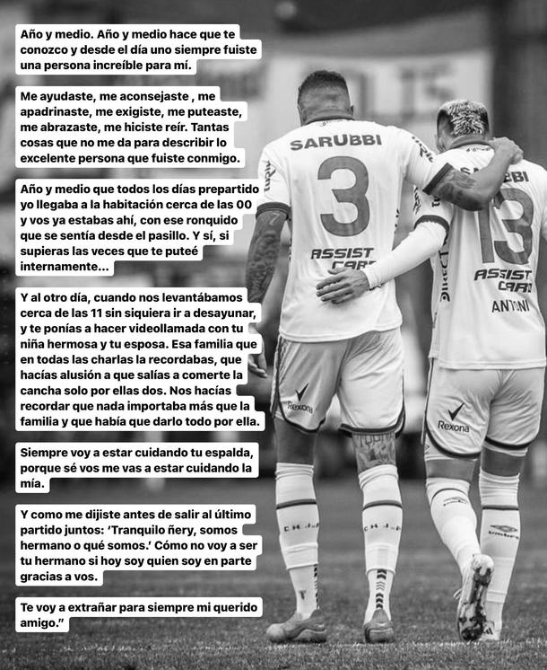 Recordó, además, una conversación que tuvo con Izquierdo antes de su último partido juntos: "Tranquilo ñery, ¿somos hermanos o qué somos? No puedo evitar sentir que, en gran parte, soy quien soy gracias a ti. Te voy a extrañar por siempre, mi querido amigo", concluyó, dejando en evidencia la profunda conexión que compartían.