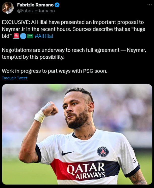 La prensa francesa y el periodista especializado en mercado de pases Fabrizio Romano aseguraron que el brasileño recibió una "oferta enorme" desde Riyadh, ciudad de origen de su posible nuevo club.