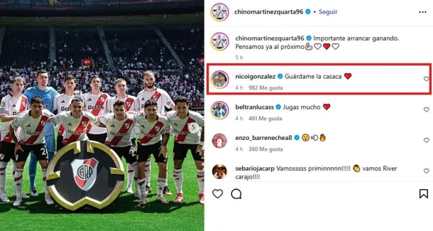 Martínez Quarta, autor de una destacada actuación en el encuentro, compartió en su cuenta de Instagram algunas fotos del partido. Y entre los pocos comentarios habilitados, uno sobresalió del resto: “Guardame la casaca”, escribió González, desatando el furor de los hinchas riverplatenses, que rápidamente llenaron de likes la publicación.